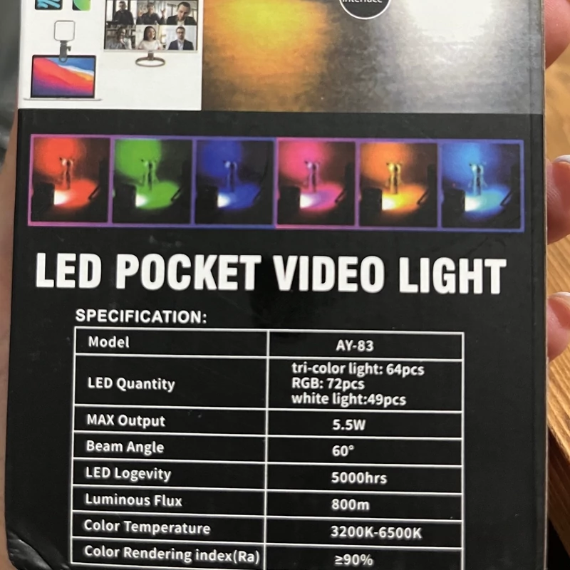 دیدن محصولات مرتبطمشخصات فنی نور LED جیبی ویدیویی: مدل: AY-83 تعداد LED: • نور سهرنگ: 64 عدد •. RGB: عدد72 • نور سفید: 49 عدد حداکثر توان خروجی: 5.5 وات زاویه پرتو نور: 60 درجه طول عمر LED: 5000 ساعت شار نوری: 800 لومن دمای رنگ: 3200K-6500K شاخص بازتولید رنگ (Ra): ≥90% رابط اتصال: Type-Cتایپ سی طراحی: رابط سرد (Cold shoe interface) چرخش 150 درجه پایه تنظیم
